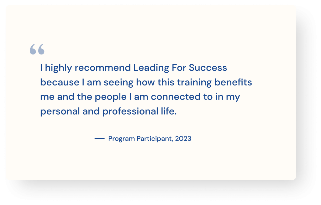 Leading For Success© (LFS) is our comprehensive leader development program that enhances how leaders lead themselves, others, and the circumstances to unleash their potential and cultivate success. Our leadership development programs empower leaders to cultivate self-awareness, build authentic relationships, and inspire teams, integrating Social-Emotional Leadership to drive engagement, innovation, and sustainable success